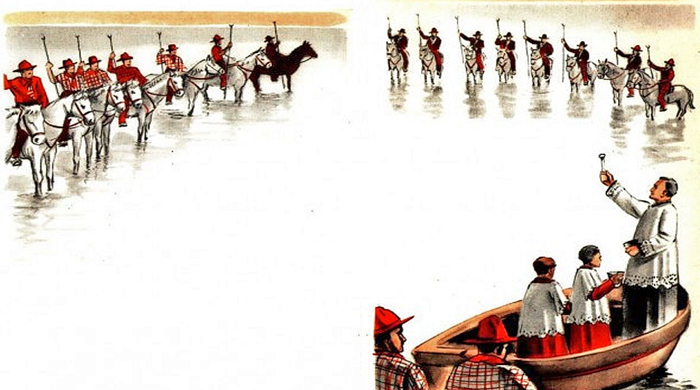 Et la bénédiction de la mer ! Voilà qui est beau à voir et émouvant. La mer toute bleue jusqu’à l’horizon ; les vagues, à petit bruit, clapotant sur la plage, comme un murmure d’oraison. Là-??haut, le ciel, tendu comme un dais de soie ; et cette lumière, toute une lumière de Paradis. Dans une barque pavoisée, a pris place le clergé, tous les prêtres sont en surplis blancs. Voici que s’avancent les Saintes portées par les épaules robustes des hommes qui, eux aussi, rentrent dans l’eau. Au-??devant d’elles accourent les guardians à cheval, la vague écumant jusqu’au poitrail des chevaux. Quelle fière allure, nos beaux guardians, leur trident brandi comme la lance des chevaliers antiques ! Jusqu’aux braves bêtes qui prennent un air de circonstance.